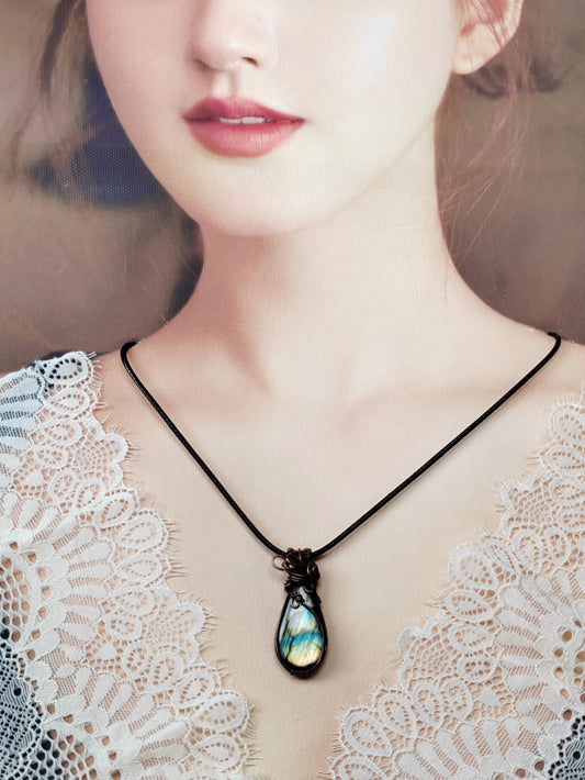 Green Labradorite Handmade Pendant Necklace- Copper Wire Wrapped Jewelry