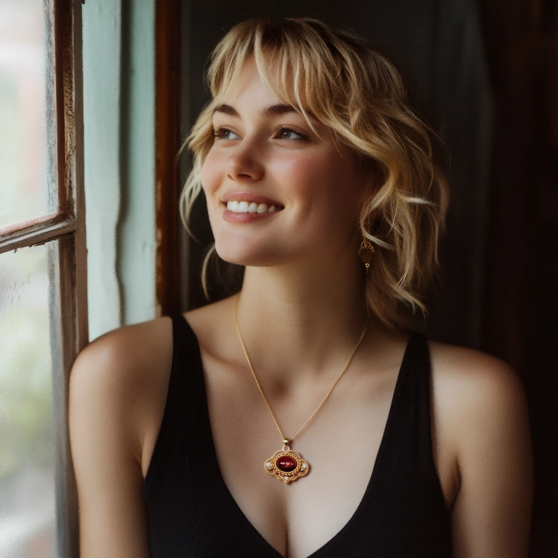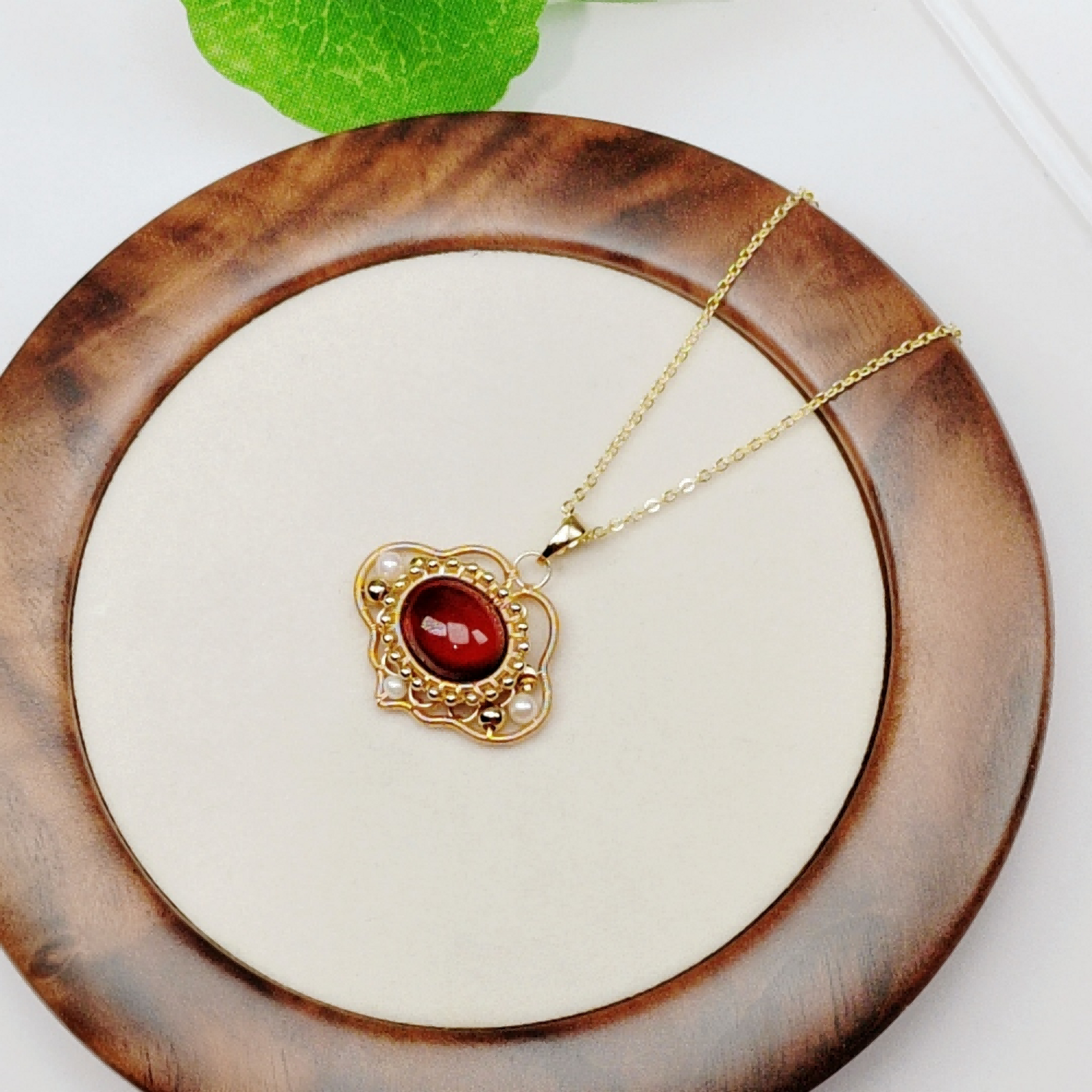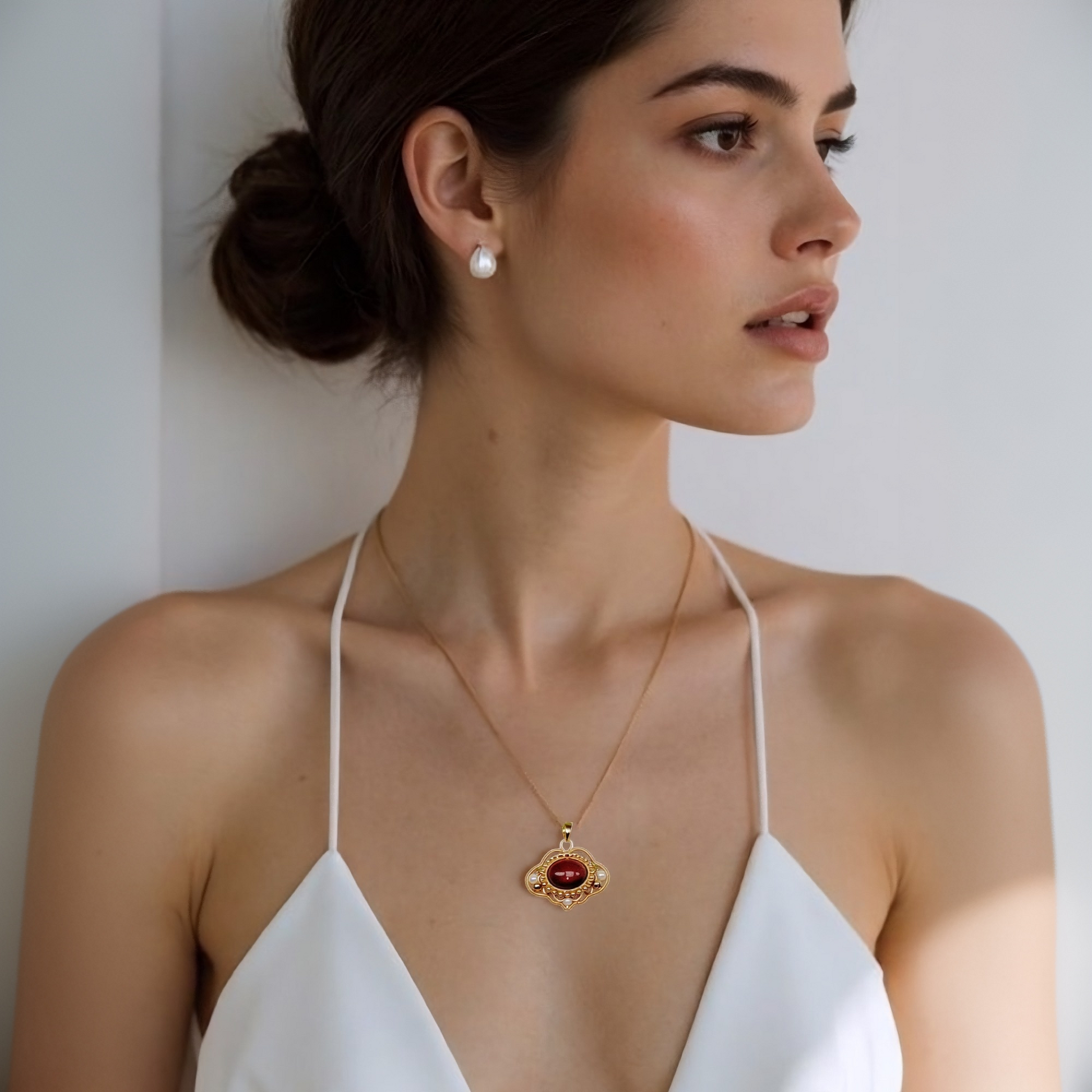 -Hand-Wrapped Imperial Design: Intricate gold-plated wire forms a traditional Chinese Ruyi Lock, symbolizing good fortune and protection. The garnet is cradled within Baroque-inspired filigree, merging Eastern symbolism with European