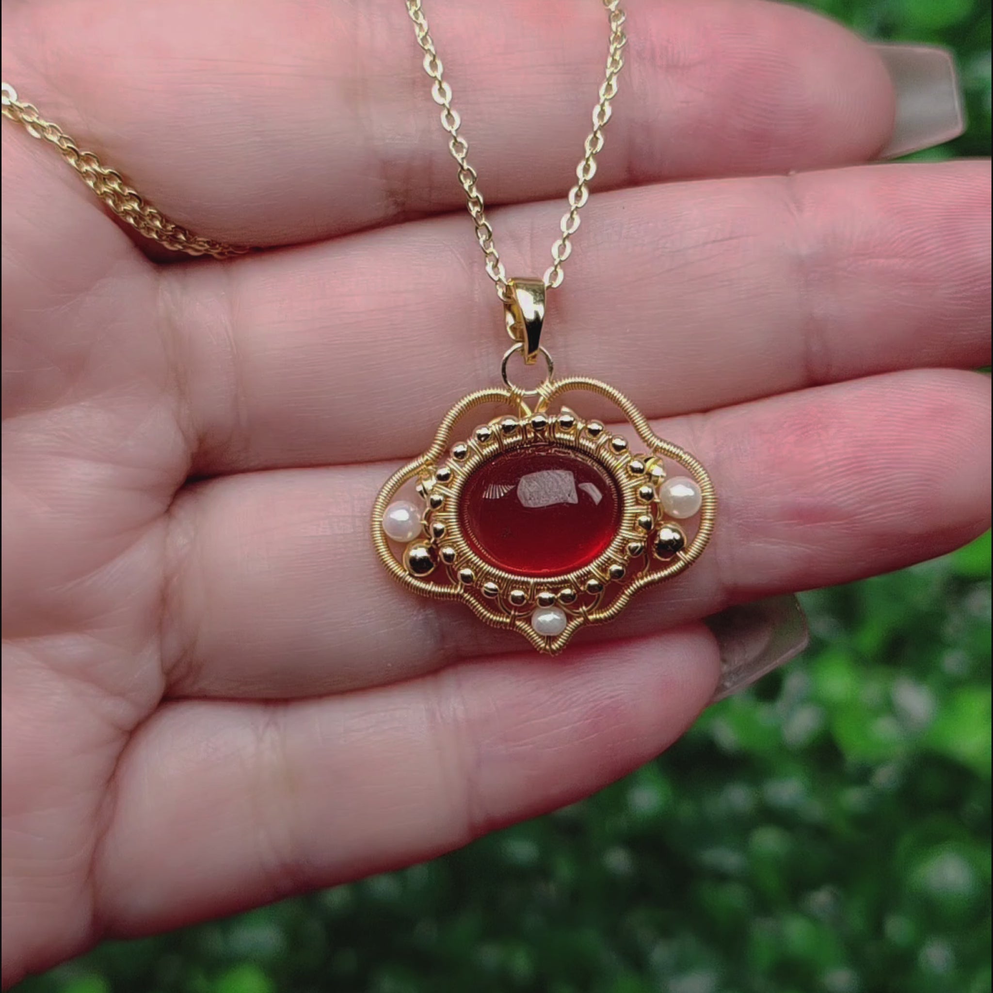 Garnet Ruyi Lock Pendant Necklace, Red Wire Wrapped Pendant, Handmade Vintage Talisman Jewelry, Healing Crystals Necklace Gift for Her Mom